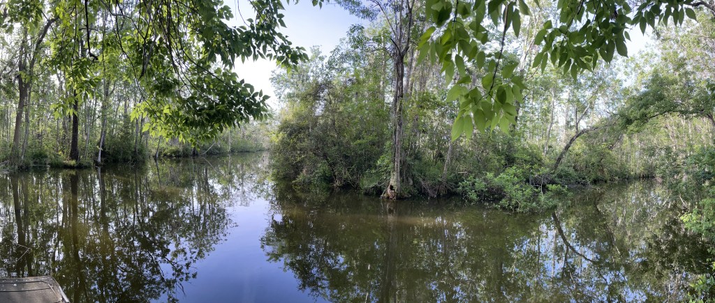 By turning left at the beginning of the loop to walk around the island clockwise, you reach a short boardwalk less than a mile later. Crossing a watery swamp, the boardwalk leads to a sitting area with two benches and then the highlight, a floating dock and canoe launch that overlooks a scenic bend in a jungle-like river that leads to Lake Denham (despite its appearance, it’s actually a canal). Though the rest of the trail walks along the perimeter of Flat Island, this is the only portion of the trail where you see open water.