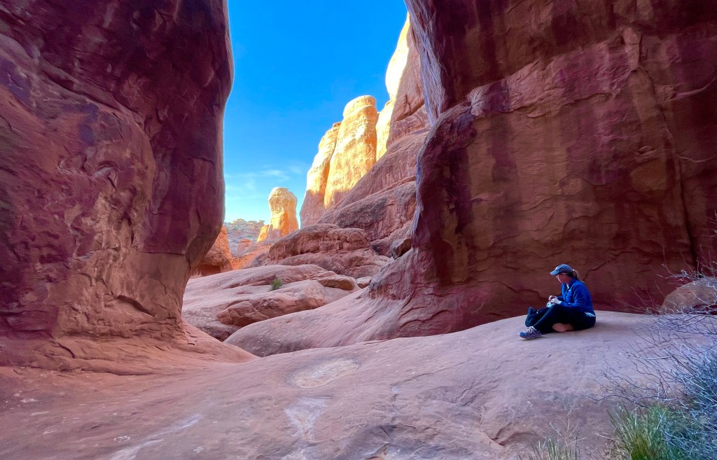 Arches National Park warns for good reason that the Fiery Furnace can be challenging and physically demanding, as many portions require you to climb steep rock faces, squeeze or lift yourself through narrow passages, and even jump or climb across crevasses (although none of those gaps lie directly above deep drops). But with that said, you don’t have to be an experienced rock climber to enjoy the Fiery Furnace. My fourteen-year-old had no problem getting through (even if she had to be coaxed through several sketchy passages), nor did I, despite being an embarrassingly out-of-shape 50-year-old with a crippling fear of heights.